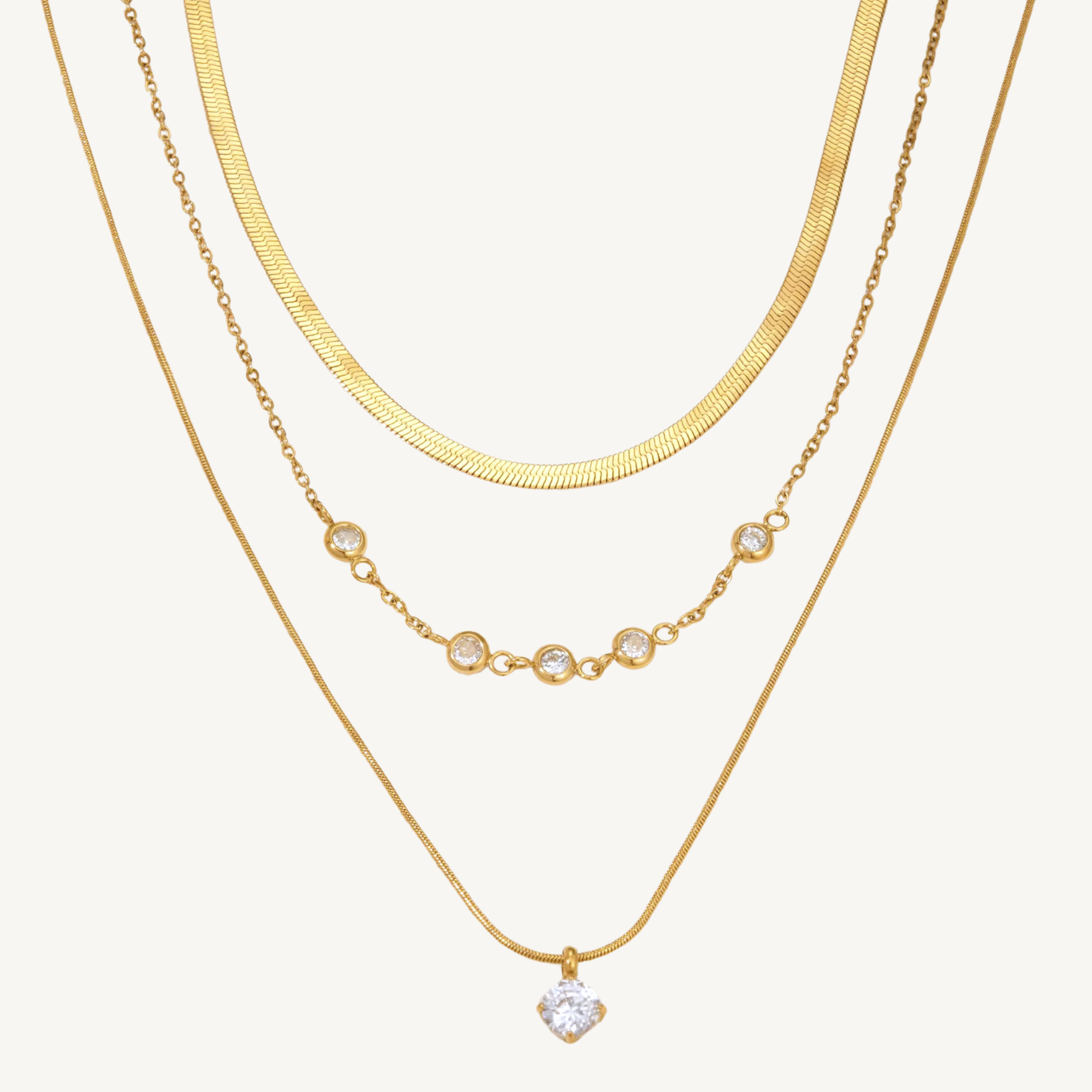 The Trinity Necklace makes effortless styling easy. Featuring a sleek snake chain, a delicate crystal-lined middle layer, and a classic solitaire pendant. It’s a ready-to-wear stack that catches the light beautifully from every angle.