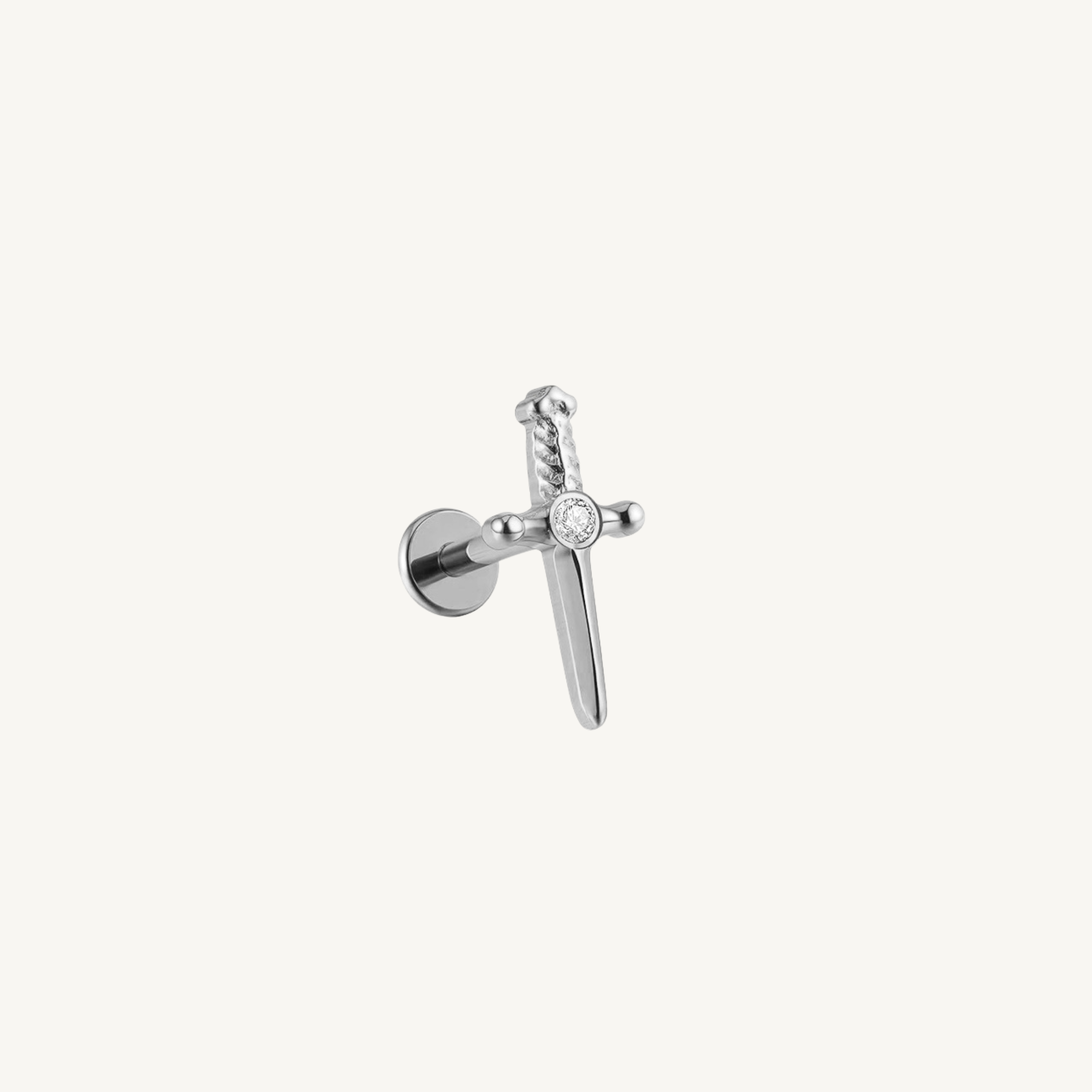 Bold and eye-catching, this dagger stud is made from titanium and finished in either unplated titanium or 14k gold plating. A bezel-set gem sits at the center of the hilt, adding a touch of sparkle to the edgy design.