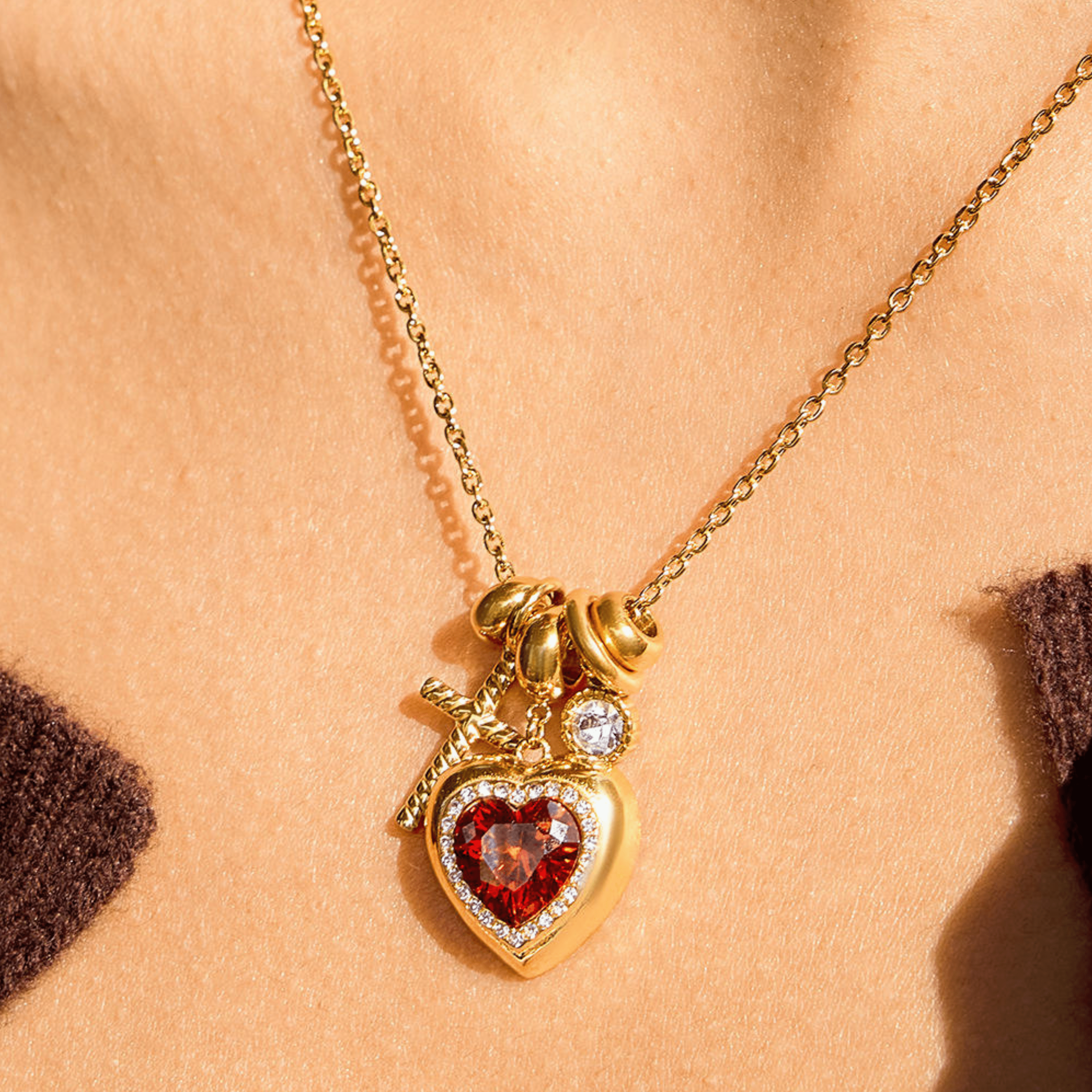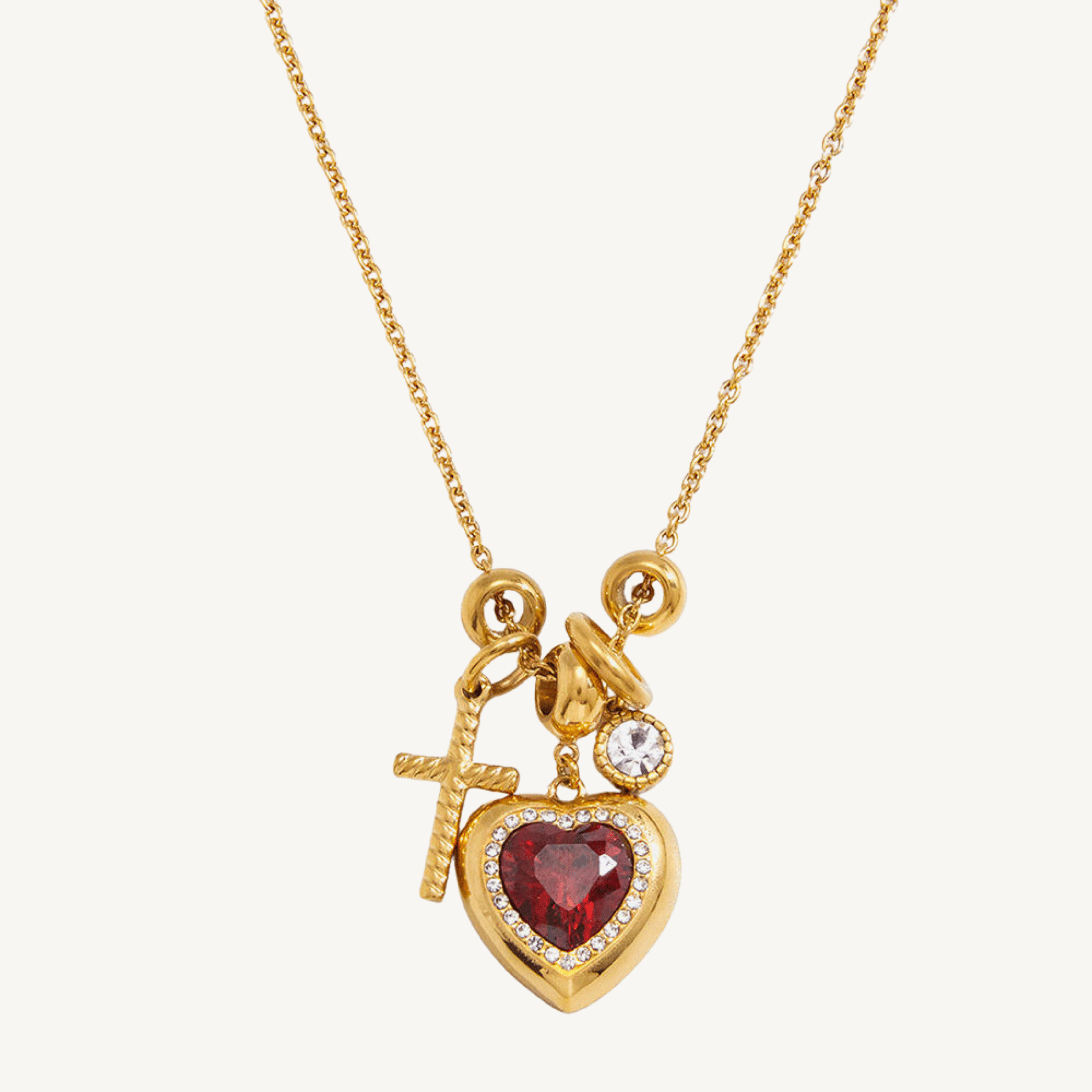 The Sacred Heart Necklace features a rich ruby-red heart framed in shimmering stones, paired with delicate gold charms that add depth and meaning. The layered pendants move effortlessly together, creating a piece that feels both romantic and powerful.